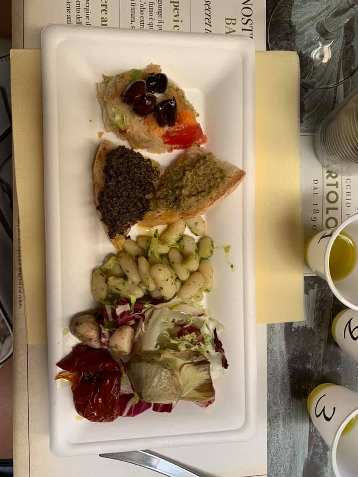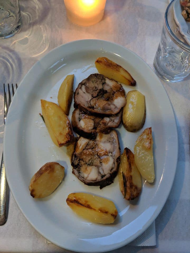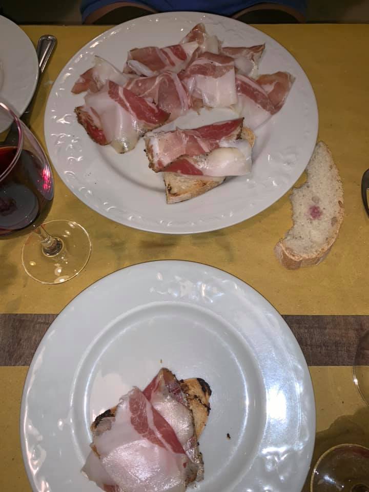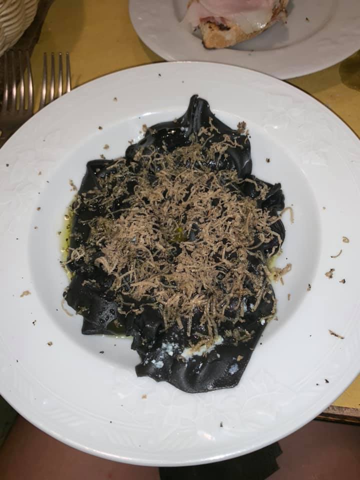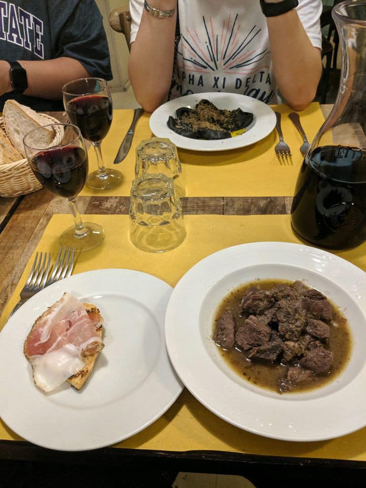 Today I tried out a new restaurant in Orvieto that I had not tried before called Anitca Cantina. Here I tried something from every section of the menu and also tried some things that I have never before tried. The first thing I tried was warm bread with lard on top and they called this “sella.” I had this once before and thought it was very good so I decided to try it again. I loved it and they gave us some extra bread to finish the meat but I preferred the lard with the warm bread. The second thing I tried was tortellacci neri and this was a black pasta stuffed with ricotta and white truffle. It was very different from anything I would normally try but it was so good. At the bottom there was a bunch of olive oil and you could use the bread they gave us to finish off the oil. This was definitely one of the best dishes I have had while being in Orvieto. The next thing I tried was wild boar which is another thing I thought I would never try but it was so good. The last thing was dessert and I tried the “quiche” which was soft cake with ricotta cheese and chocolate. It came out to us warm and it was absolutely delicious. It was very moist and had a lot of flavor. With the meal we paired a red wine. We asked our waitress what would go best with the wild boar and she suggested the house wine. The wine was 80 percent sangiovese and 20 percent merlot and was a 13.5 percent alcohol content. It was a relatively young wine and was made at a vineyard called Palpalazzoni. At first it was not great but once I paired it with the food I actually started to really enjoy it. It went really well with the boar and is the first red wine I have enjoyed. Overall this restaurant was amazing they had wonderful service and the chef even came out and talked to us. On top of all that the food I had was delicious every single course and the wine. I would definitely go back here.