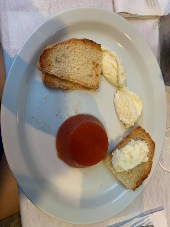 Picture Two: This was the appetizer which was tomato pudding and pecorino cheese. The tomato thing was weird but the cheese on top of the bread was really good.